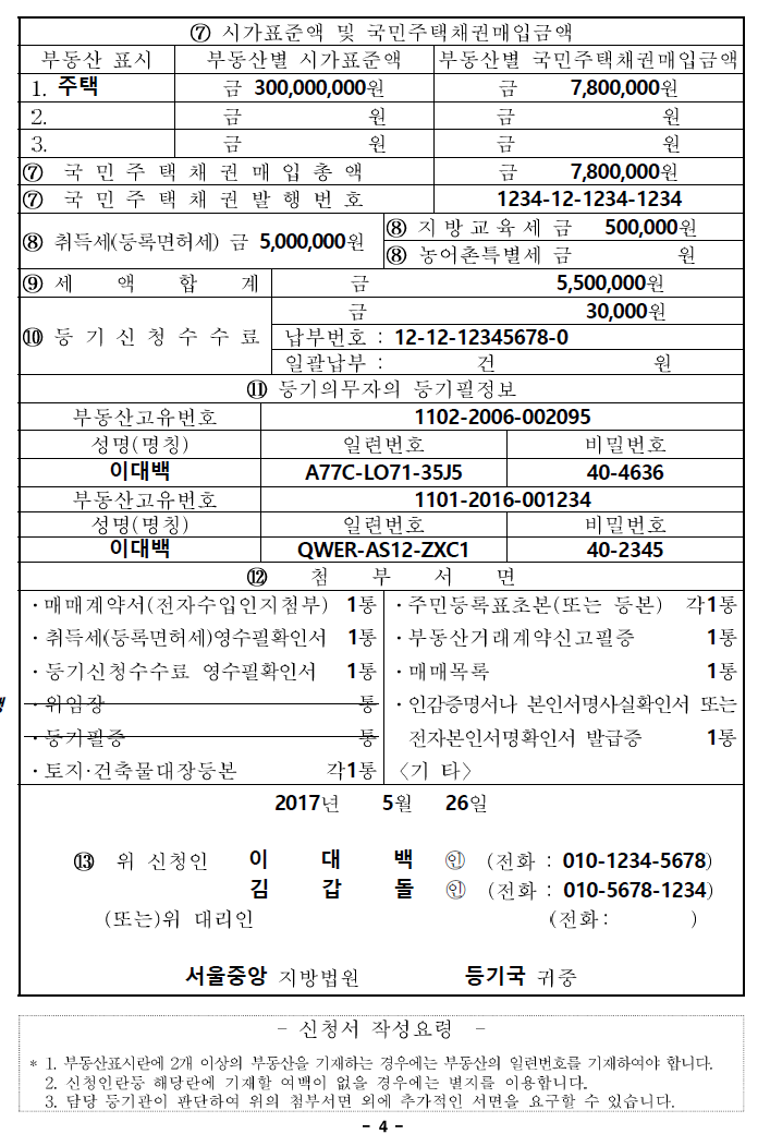 이 신청서에 소유권 이전에 관한 토지/주택, 매도인, 매수인의 기본 정보와 부가 자료들이 기록되고
