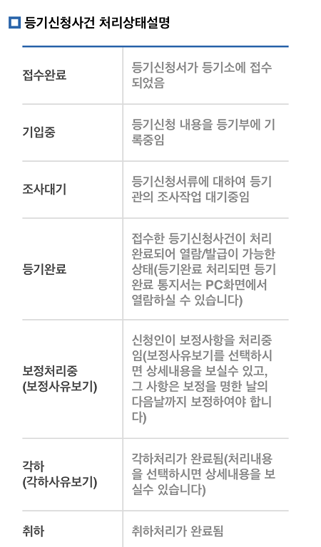 소유권 등기 이전 신청 후 처리 단계는 아래와 같습니다.