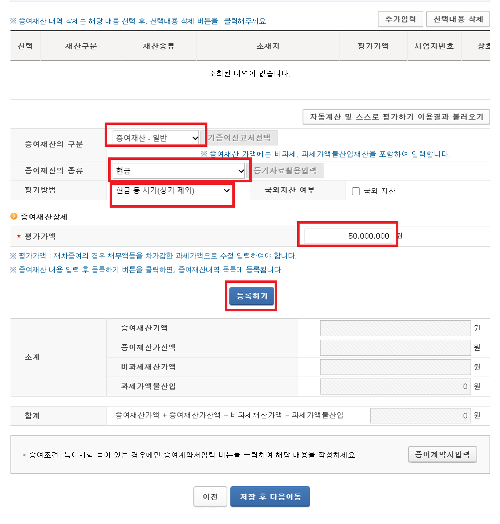 증여자(부모님) 주민번호를 입력하고 조회하면 자동으로 수증자(나) 정보는 입력되고 확인 버튼을 누르고